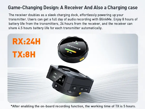 내장 녹화 기능을 끄면 송신기는 완전히 충전된 상태에서 약 8시간 동안 사용할 수 있습니다. 내장 녹화 기능을 켠 상태에서는 배터리 수명이 약 5시간입니다.